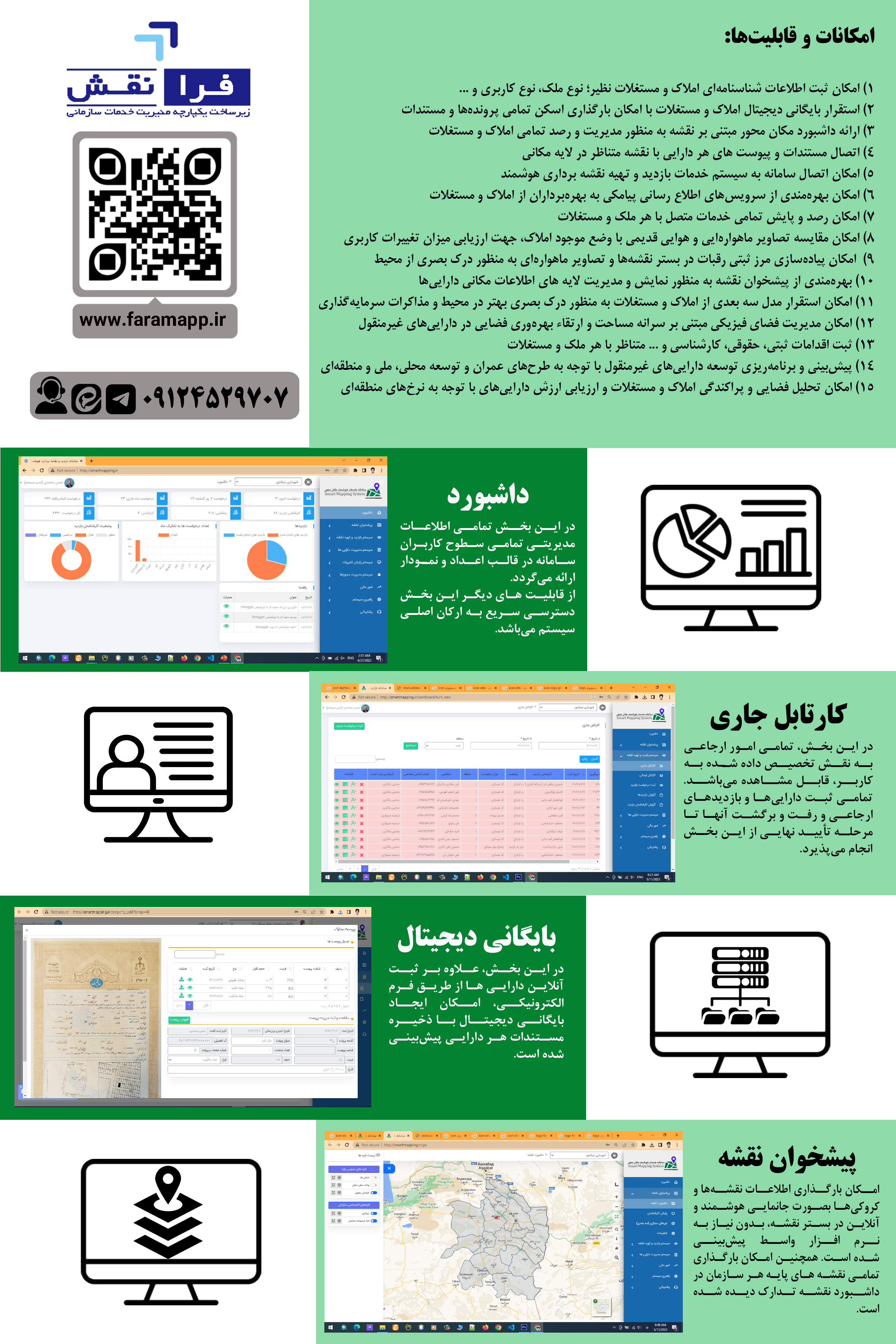 «سامانه مدیریت املاک و مستغلات»، بستر نرم افزاری است که با بهرهمندی از فناوریهای سیستم اطلاعات جغرافیایی (GIS) و سنجش از راه دور (RS) در بستر web، این امکان را مهیا ساخته است که هر فرد حقیقی یا حقوقی به فراخور نوع مأموریت و منابع مکانی در اختیار (اعم از؛ زمین، ملک، مستغلات، اراضی و ...) در اولین گام بتواند با ایجاد هر رکورد مکانی و افزودن اطلاعات توصیفی و مستندات پیوست (اسناد مالکیت، استعلامها، نقشهها، گزارشها، تصاویر و ...) امکان بایگانی و فراخوانی اطلاعات ذخیره شده خود را در کمترین زمان ممکن با قابلیت جستجو در بستر نقشه داشته باشد. این امر از طریق بارگذاری اطلاعات توصیفی و مکانی (لایهها و نقشههای اختصاصی) بصورت لایههای اطلاعاتی و همچنین بهرهمندی از اطلاعات و لایههای عمومی از قبیل (تقسیمات سیاسی، معابر عمومی، عوارض محیطی و ...) برای تمامی سازمانها امکانپذیر میباشد. ضمناً با بهره مندی از خدمات پیشخوان نقشه علاوه بر مدیریت اطلاعات مکانی، امکان مشاهده مدل های سه بعدی و مقایسه کاربری یک زمین، ملک یا بنا در ادوار زمانی گذشته تا وضع موجود با استفاده از تصاویر هوایی، ماهواره ای یا تصاویر برداشت شده از برداشتهای پهپادی می باشد.