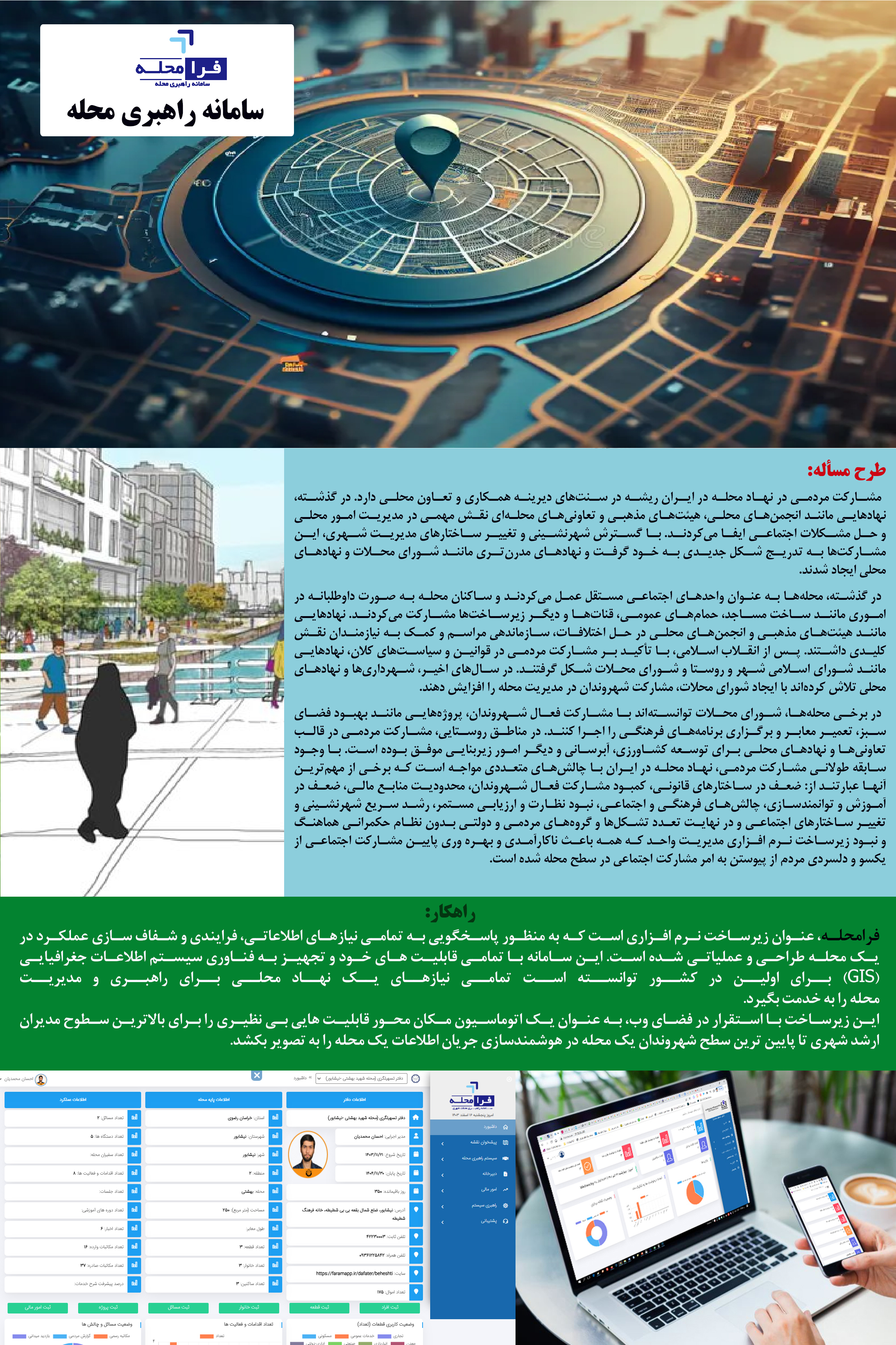فرامحله، عنوان زیرساخت نرم افزاری است که به منظور پاسخگویی به تمامی نیازهای اطلاعاتی، فرایندی و شفاف سازی عملکرد در یک محله طراحی و عملیاتی شده است. این سامانه با تمامی قابلیت های خود و تجهیز به فناوری سیستم اطلاعات جغرافیایی (GIS) برای اولین در کشور توانسته است تمامی نیازهای یک نهاد محلی برای راهبری و مدیریت محله را به خدمت بگیرد.