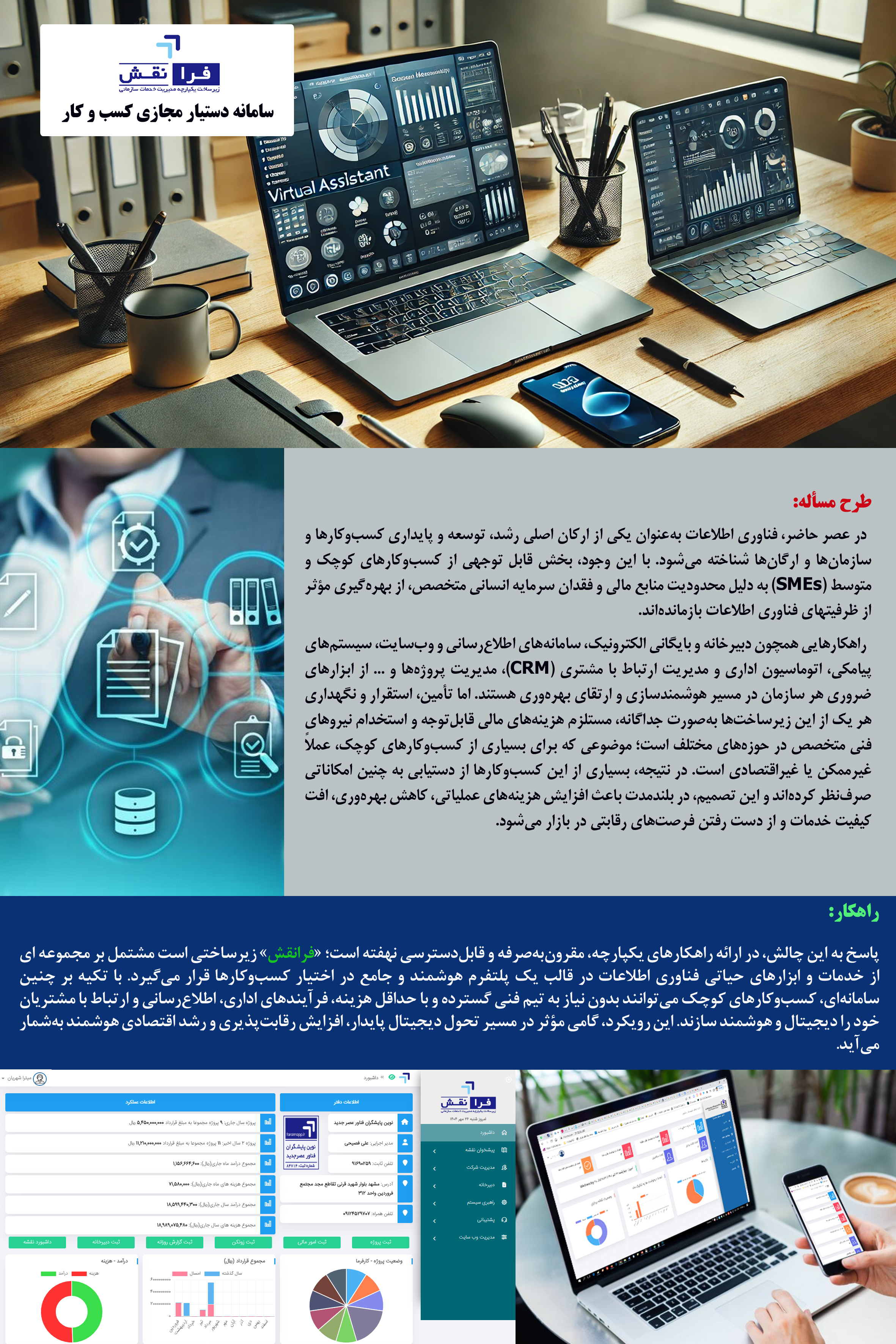 پاسخ به این چالش، در ارائه راهکارهای یکپارچه، مقرونبهصرفه و قابلدسترسی نهفته است؛ «فرانقش» زیرساختی است مشتمل بر مجموعه ای از خدمات و ابزارهای حیاتی فناوری اطلاعات در قالب یک پلتفرم هوشمند و جامع در اختیار کسبوکارها قرار میگیرد. با تکیه بر چنین سامانهای، کسبوکارهای کوچک میتوانند بدون نیاز به تیم فنی گسترده و با حداقل هزینه، فرآیندهای اداری، اطلاعرسانی و ارتباط با مشتریان خود را دیجیتال و هوشمند سازند. این رویکرد، گامی مؤثر در مسیر تحول دیجیتال پایدار، افزایش رقابتپذیری و رشد اقتصادی هوشمند بهشمار میآید.